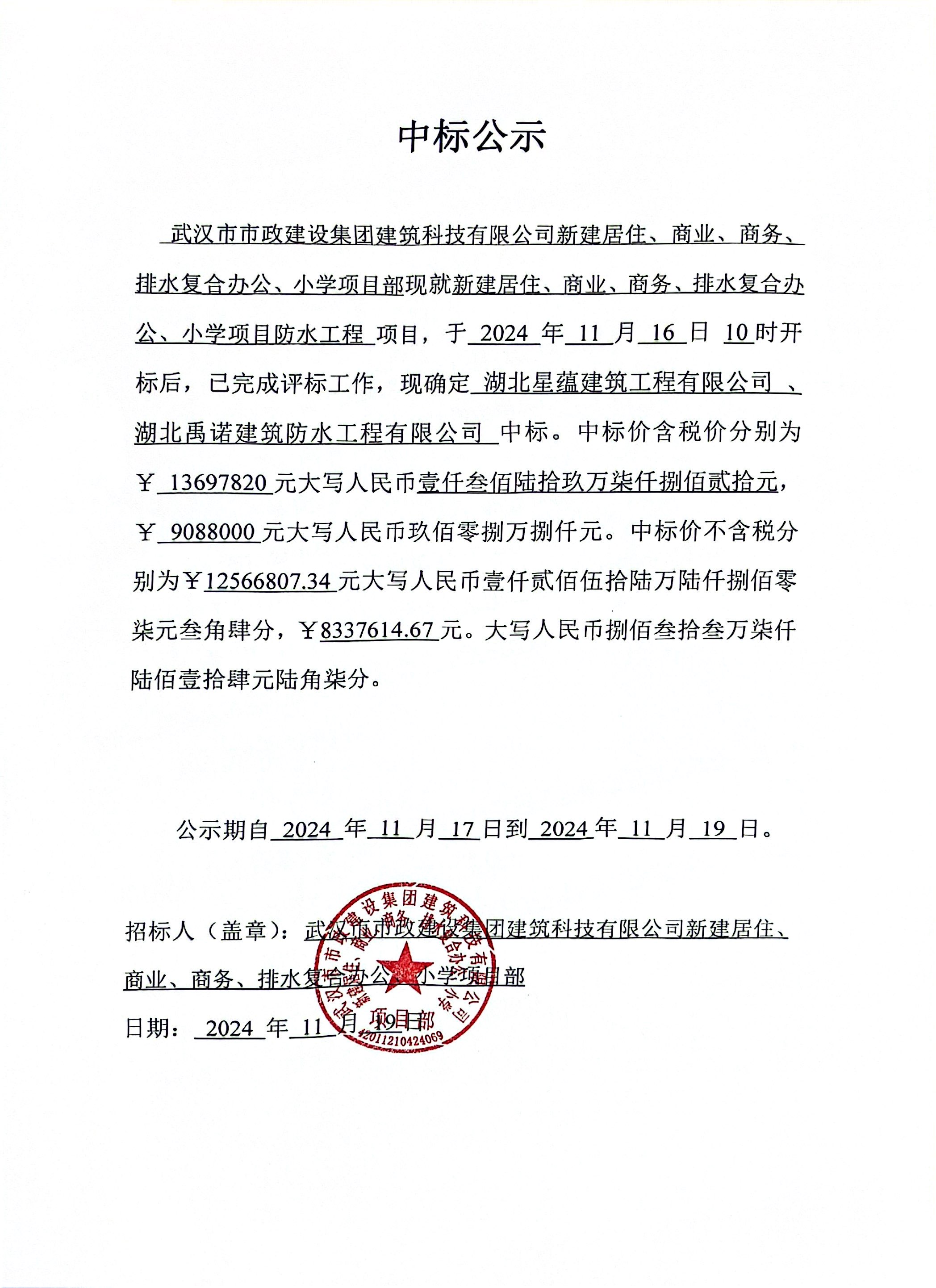 武漢市市政建設集團建筑科技有限公司新建居住、商業、商務、排水復合辦公、小學項目防水工程中標公示