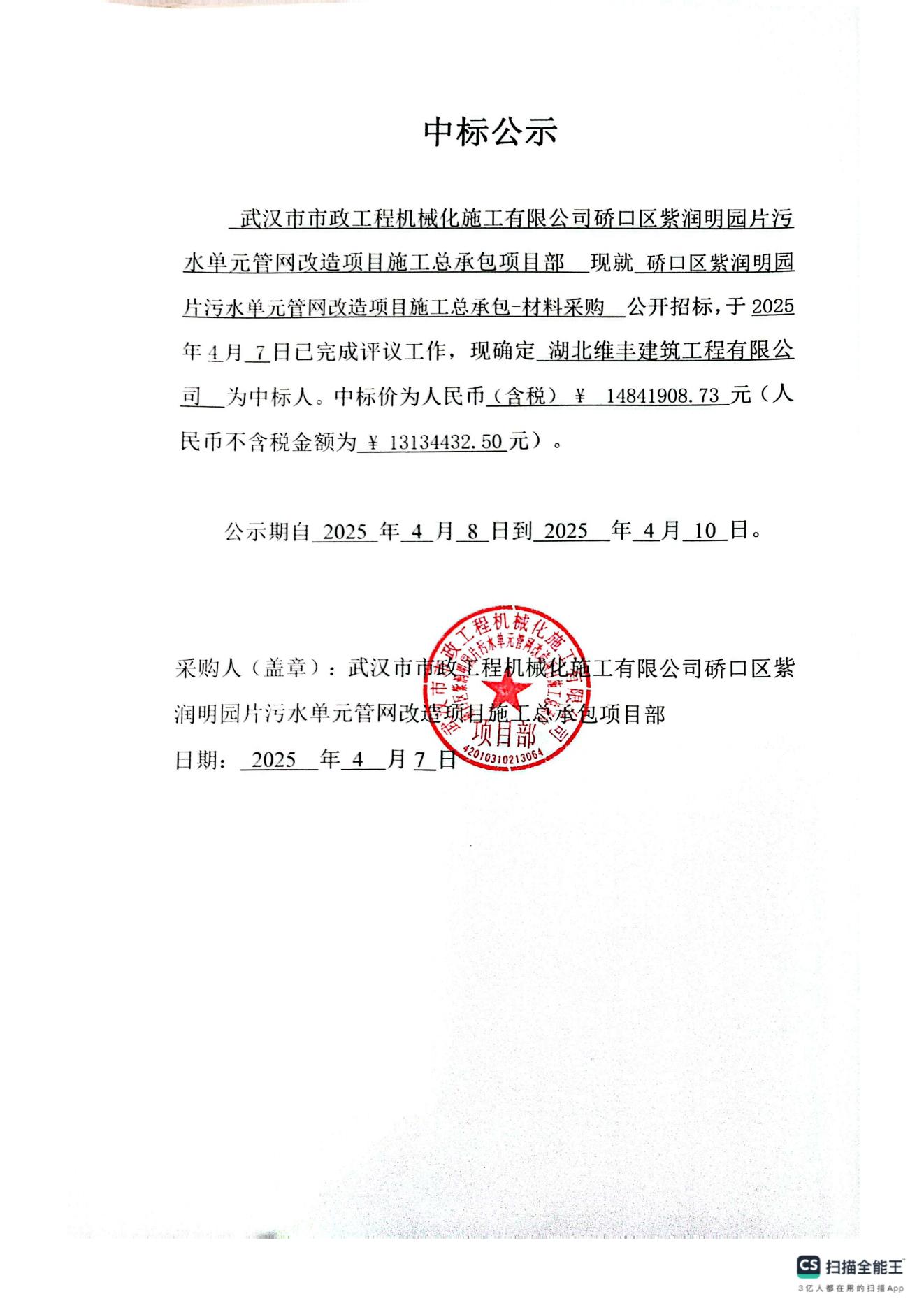 硚口區(qū)紫潤明園片污水單元管網(wǎng)改造項目施工總承包-材料采購中標公示