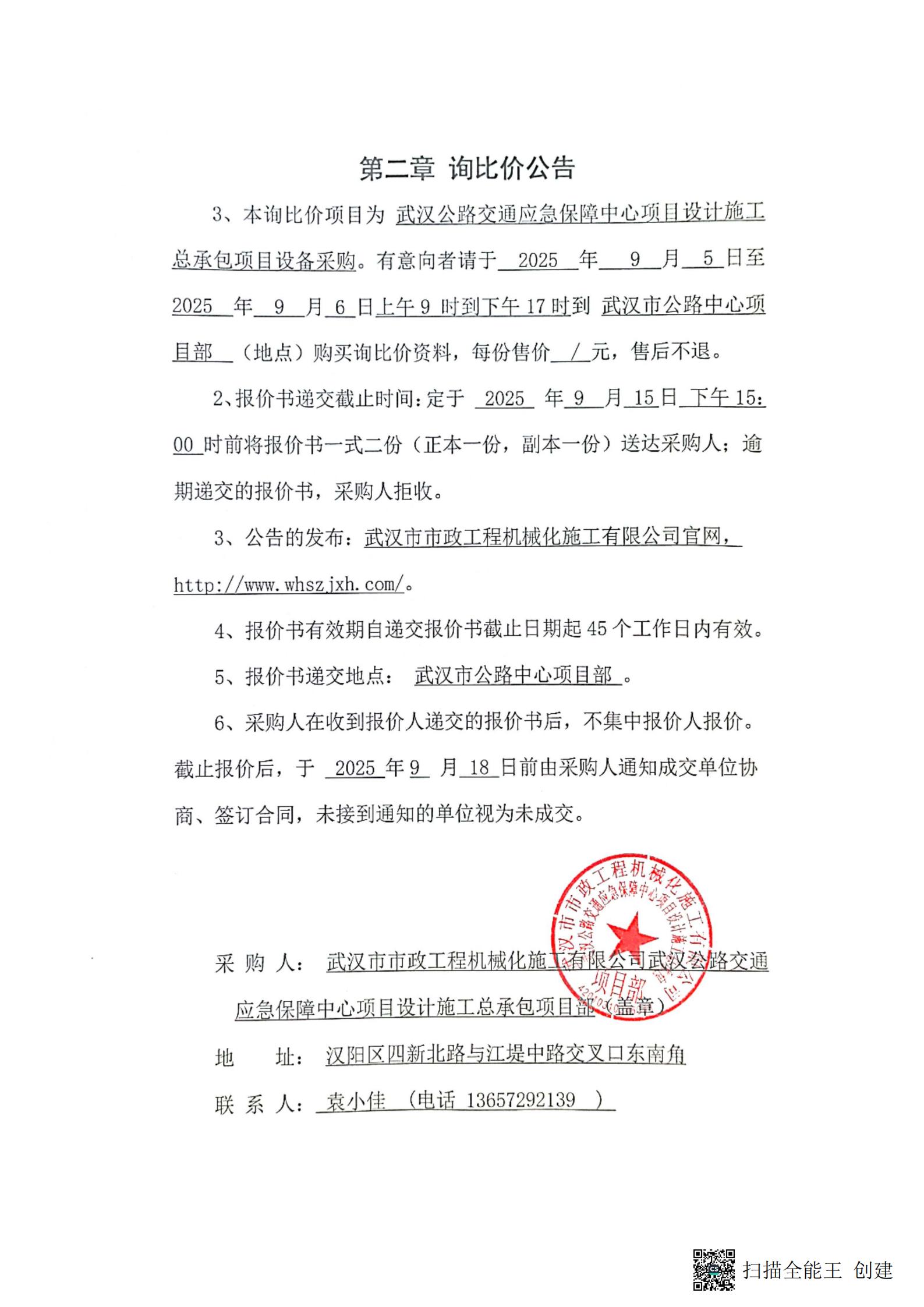武漢公路交通應急保障中心項目設計施工總承包項目設備采購詢價公告