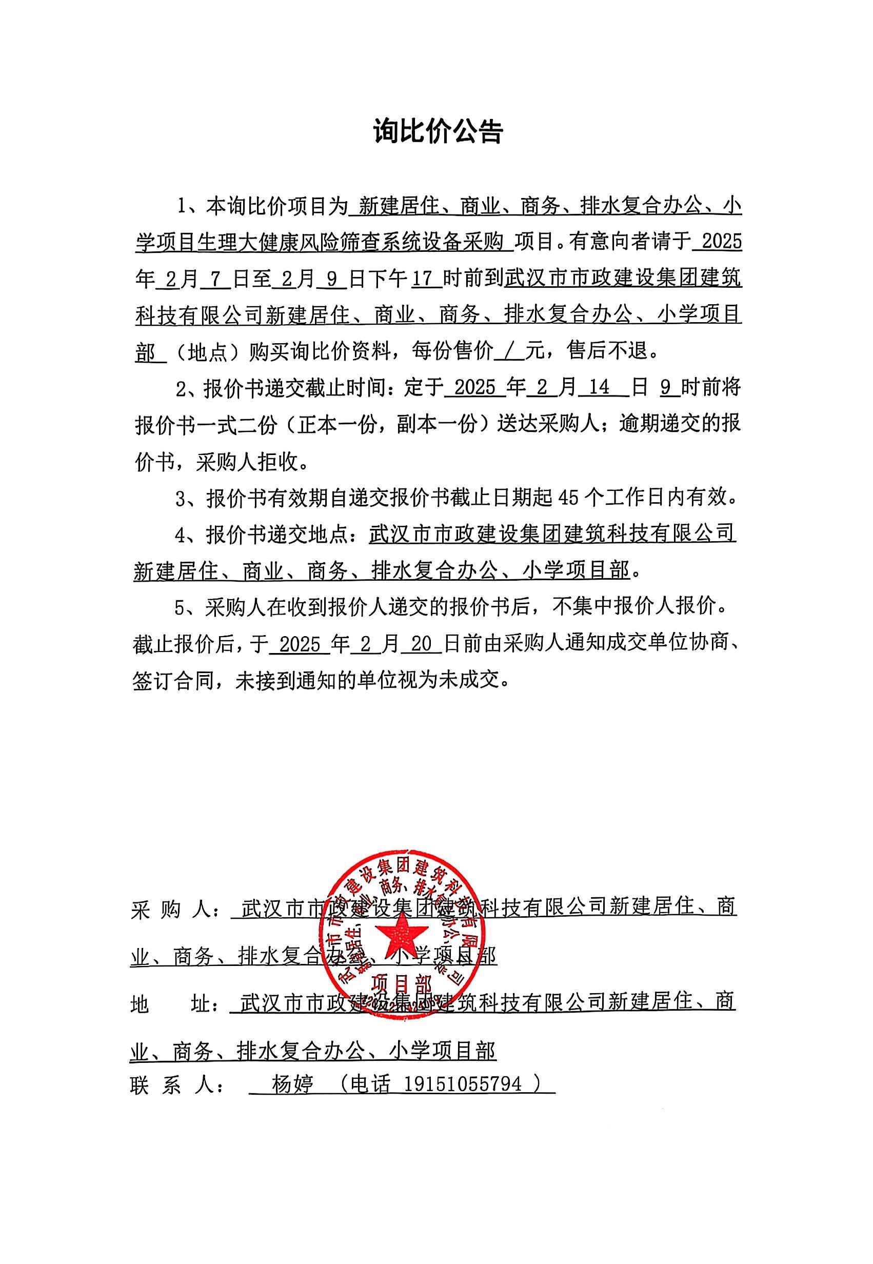 武漢市市政建設(shè)集團(tuán)建筑科技有限公司新建居住、商業(yè)、商務(wù)、排水復(fù)合辦公、小學(xué)項(xiàng)目生理大健康風(fēng)險(xiǎn)篩查系統(tǒng)設(shè)備采購(gòu)詢價(jià)公告