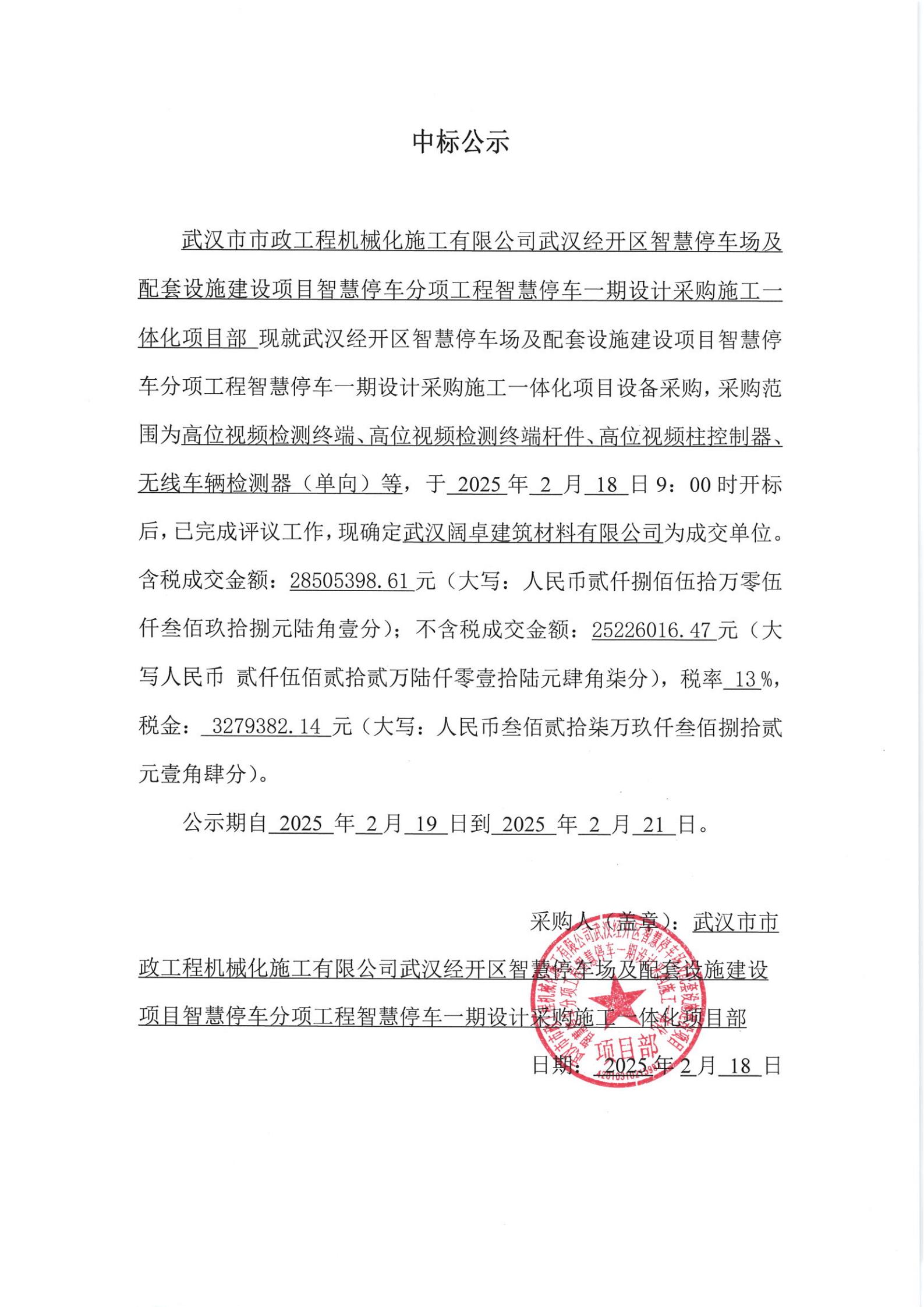 武漢經開區(qū)智慧停車場及配套設施建設項目智慧停車分項工程智慧停車一期設計采購施工一體化項目 設備采購成交公示