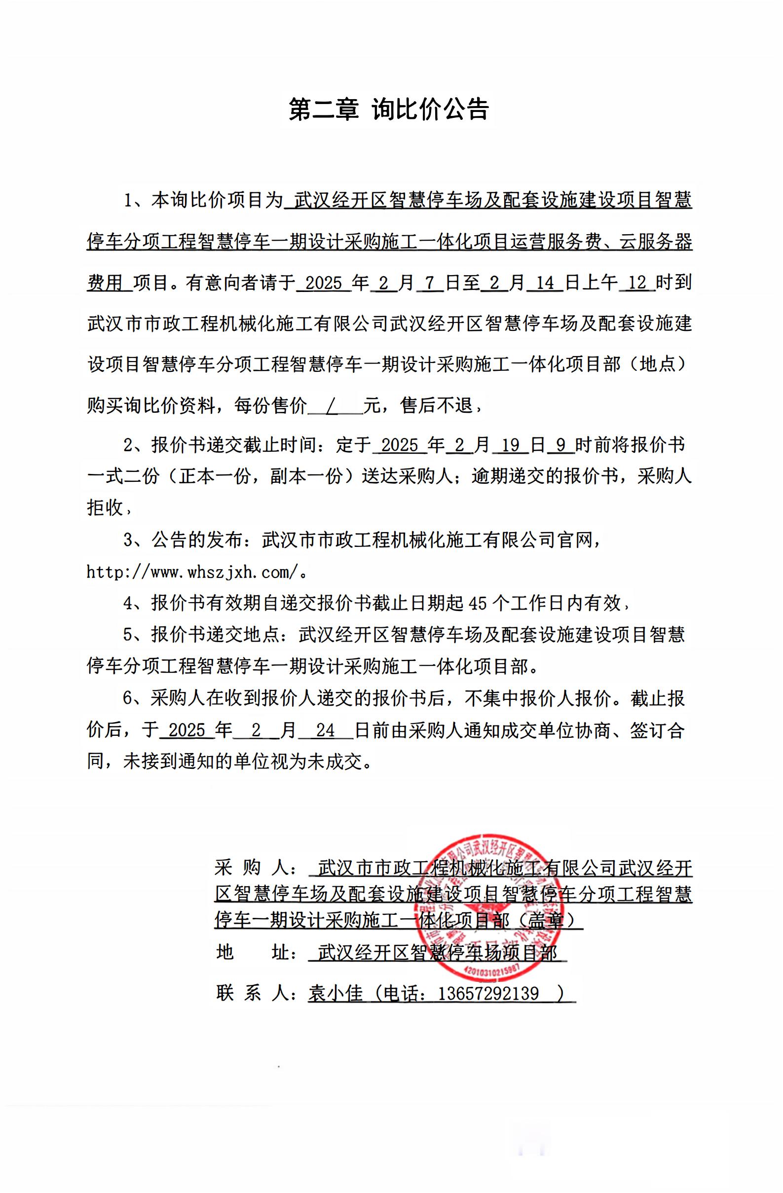 武漢經開區智慧停車場及配套設施建設項目智慧停車分項工程智慧停車一期設計采購施工一體化項目運營服務費、云服務器費用詢價公告