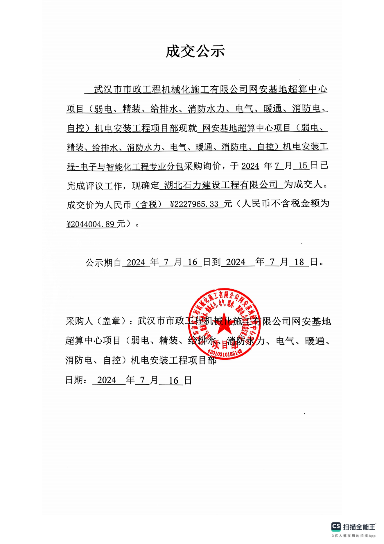 網安基地超算中心項目(弱電、精裝、給排水、消防水力、電氣、暖通、消防電、自控)機電安裝工 程-電子與智能化工程專業分包采購詢價成交公示成交公示