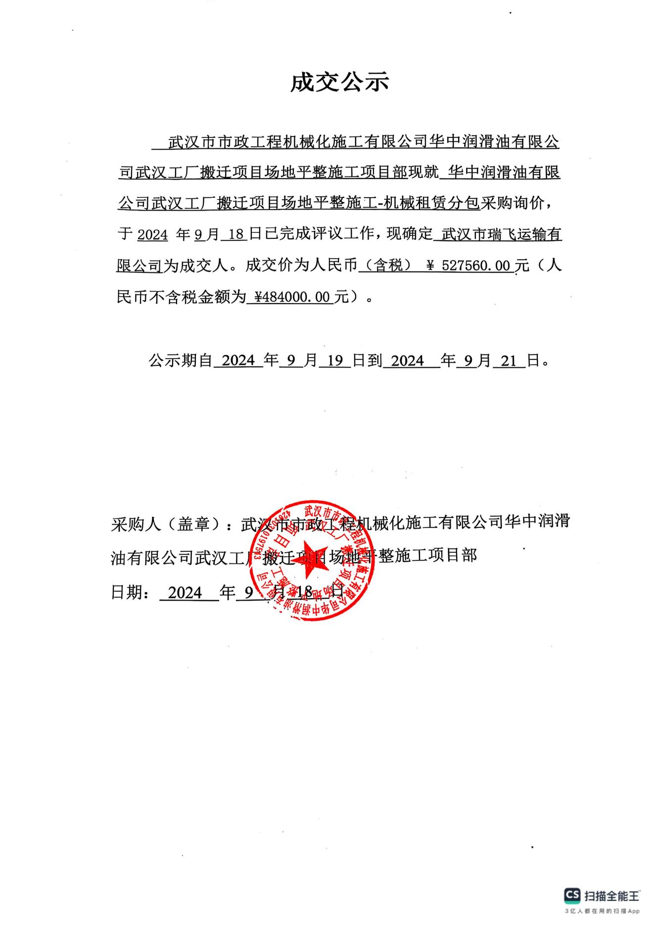 華中潤滑油有限公司武漢工廠搬遷項且場地平整施工機械租賃分包成交公示