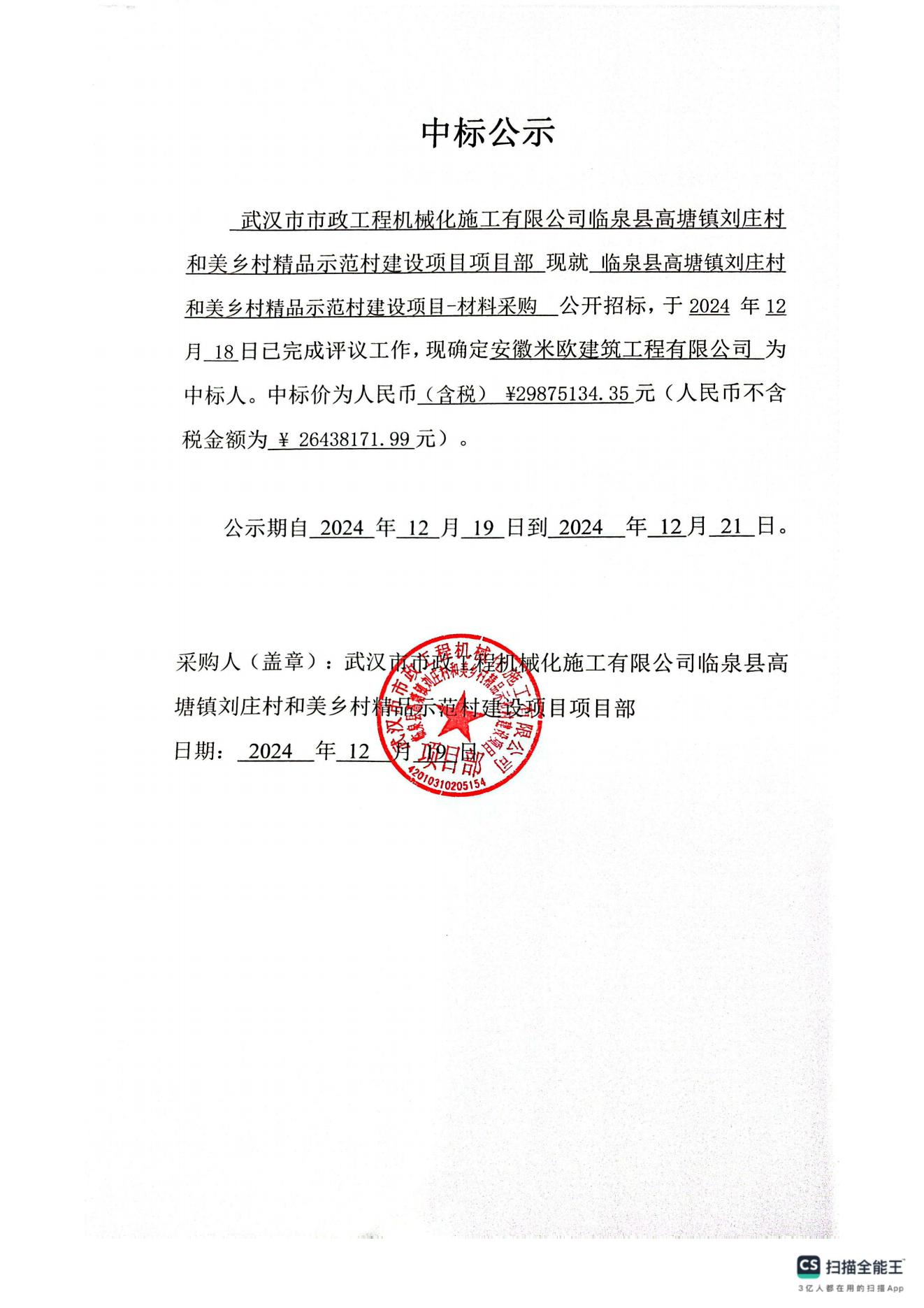 臨泉縣高塘鎮(zhèn)劉莊村和美鄉(xiāng)村精品示范村建設(shè)項(xiàng)目-材料采購中標(biāo)公示