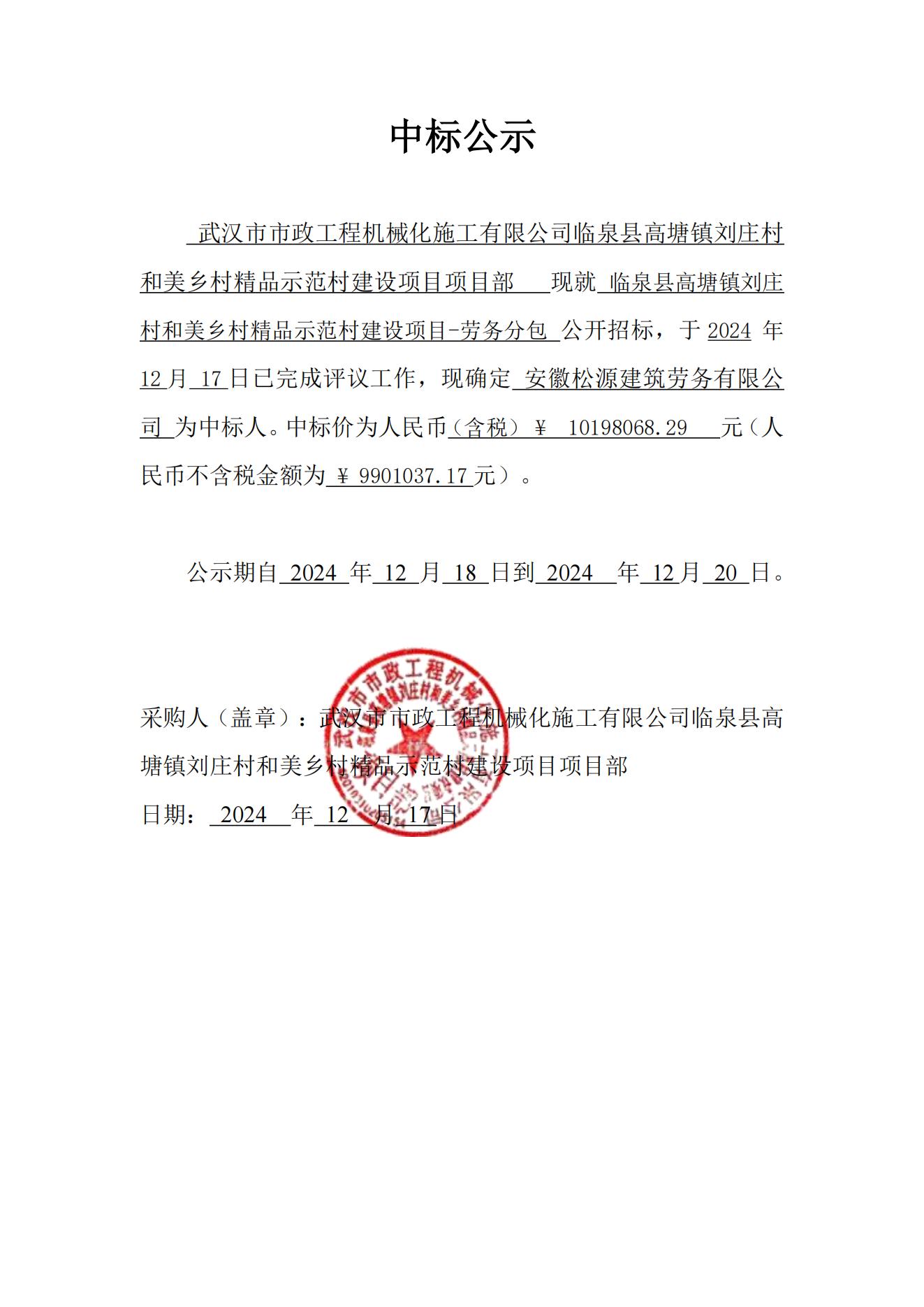 臨泉縣高塘鎮(zhèn)劉莊村和美鄉(xiāng)村精品示范村建設(shè)項目-勞務(wù)分包中標(biāo)公示