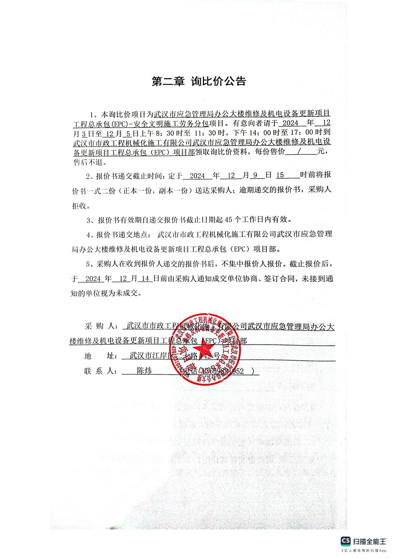 武漢市應急管理局辦公大樓維修及機電設備更新項目工程總承包(EPC)-安全文明施工勞務分包詢價公告