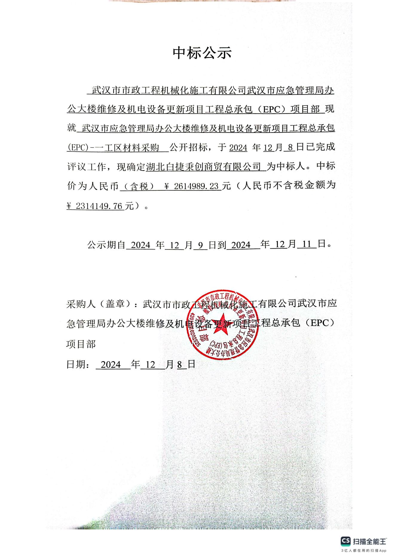 武漢市應急管理局辦公大樓維修及機電設備更新項目工程總承包(EPC)-一工區材料采購中標公示