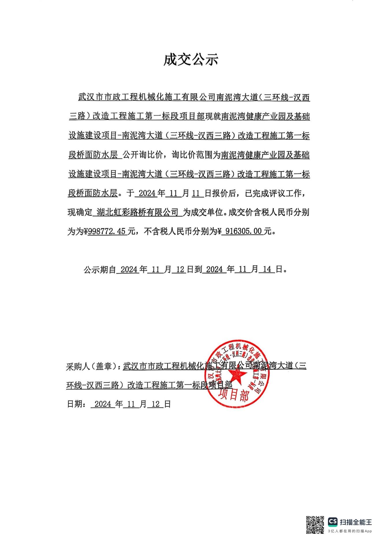 南泥灣健康產業園及基礎設施建設項目-南泥灣大道(三環線-漢西三路)改造工程施工第一標段橋面防水層成交公示