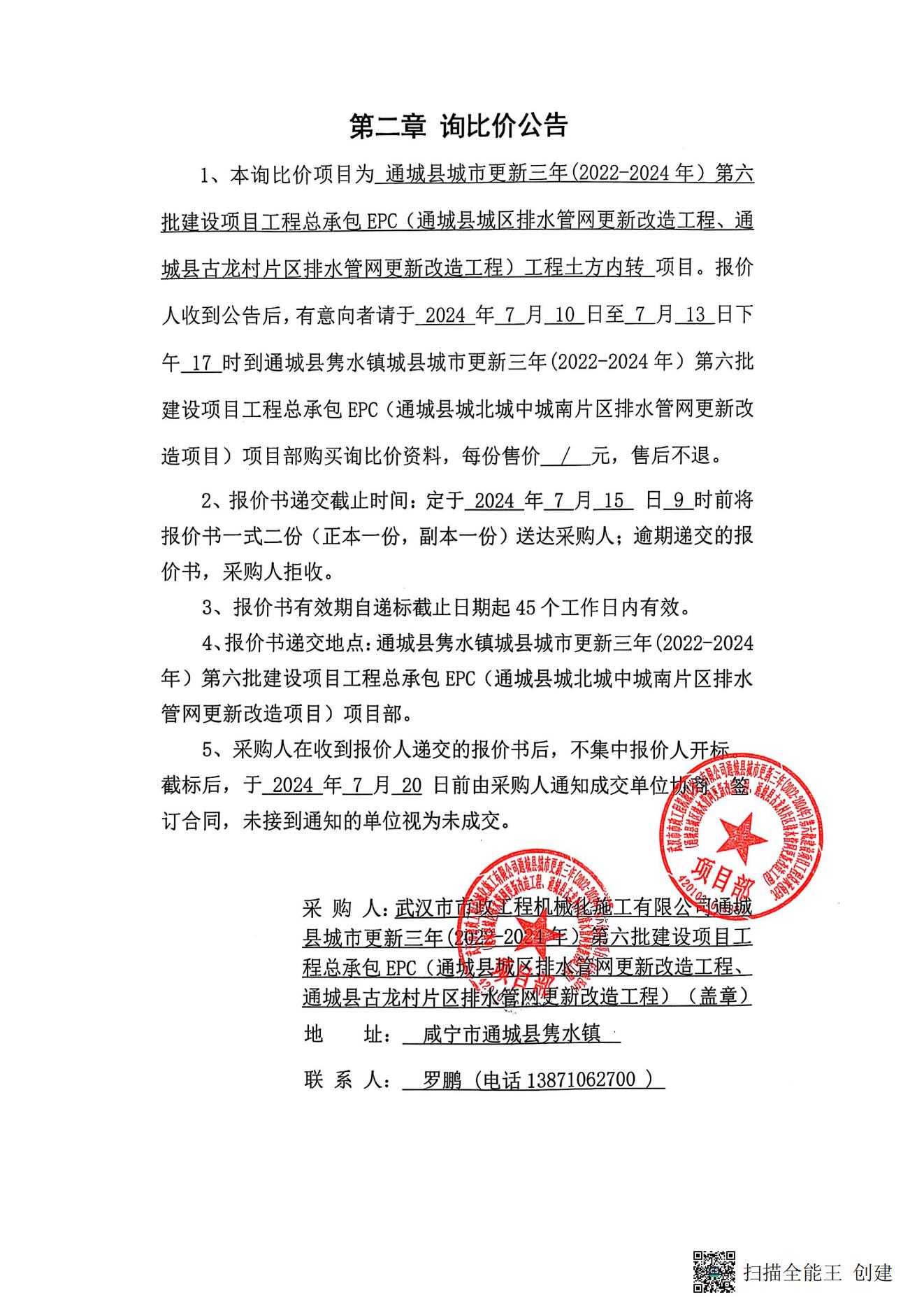 通城縣城市更新三年(2022-2024年)第六批建設項目工程總承包EPC(通城縣城北城中城南片區(qū)排水管網(wǎng)更新改造項目)土方內(nèi)轉工程詢價公告