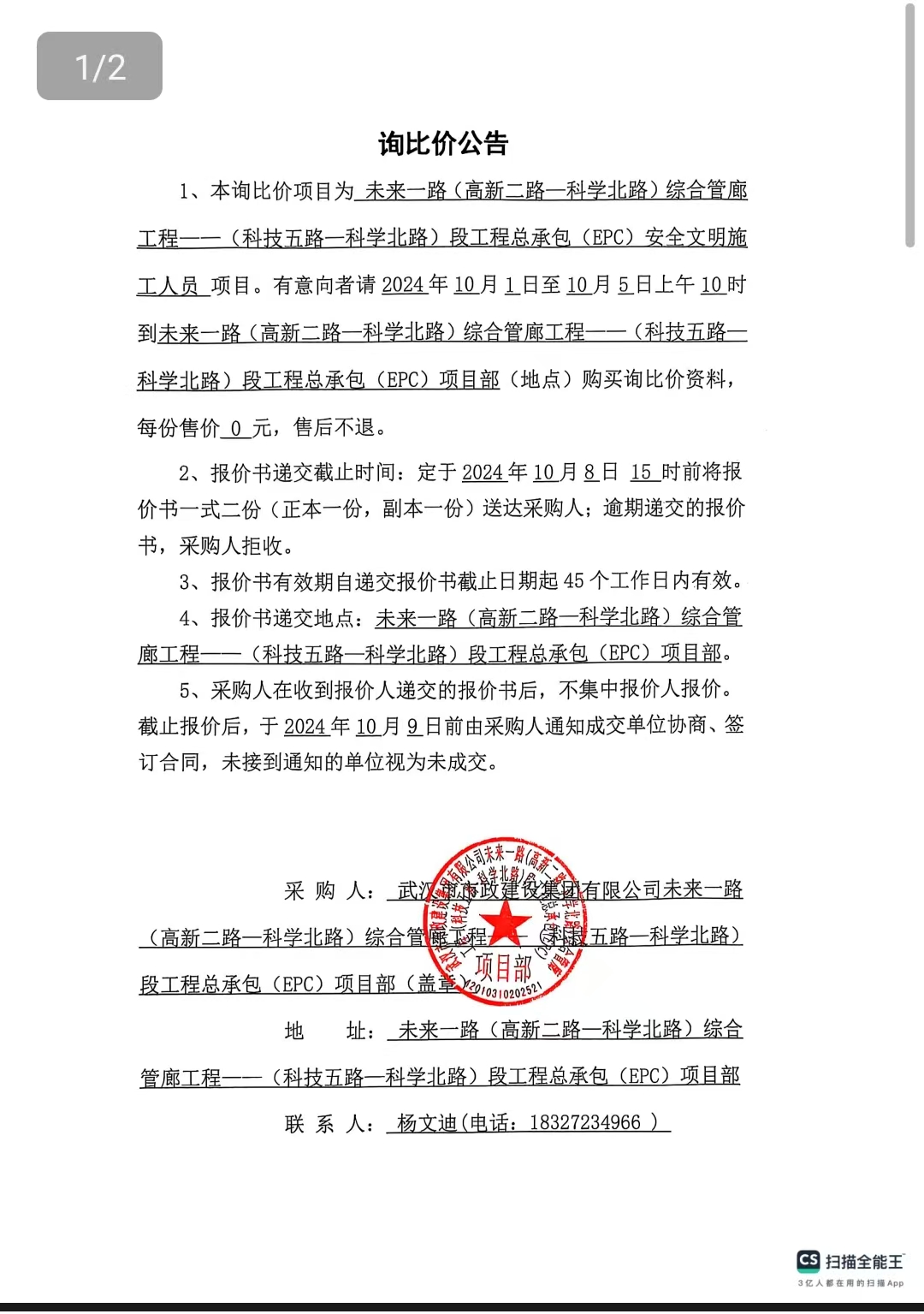 未來一路(高新二路—科學北路)綜合管廊工程——(科技五路—科學北路)段工程總承包(EPC)安全文明施工人員詢價公告