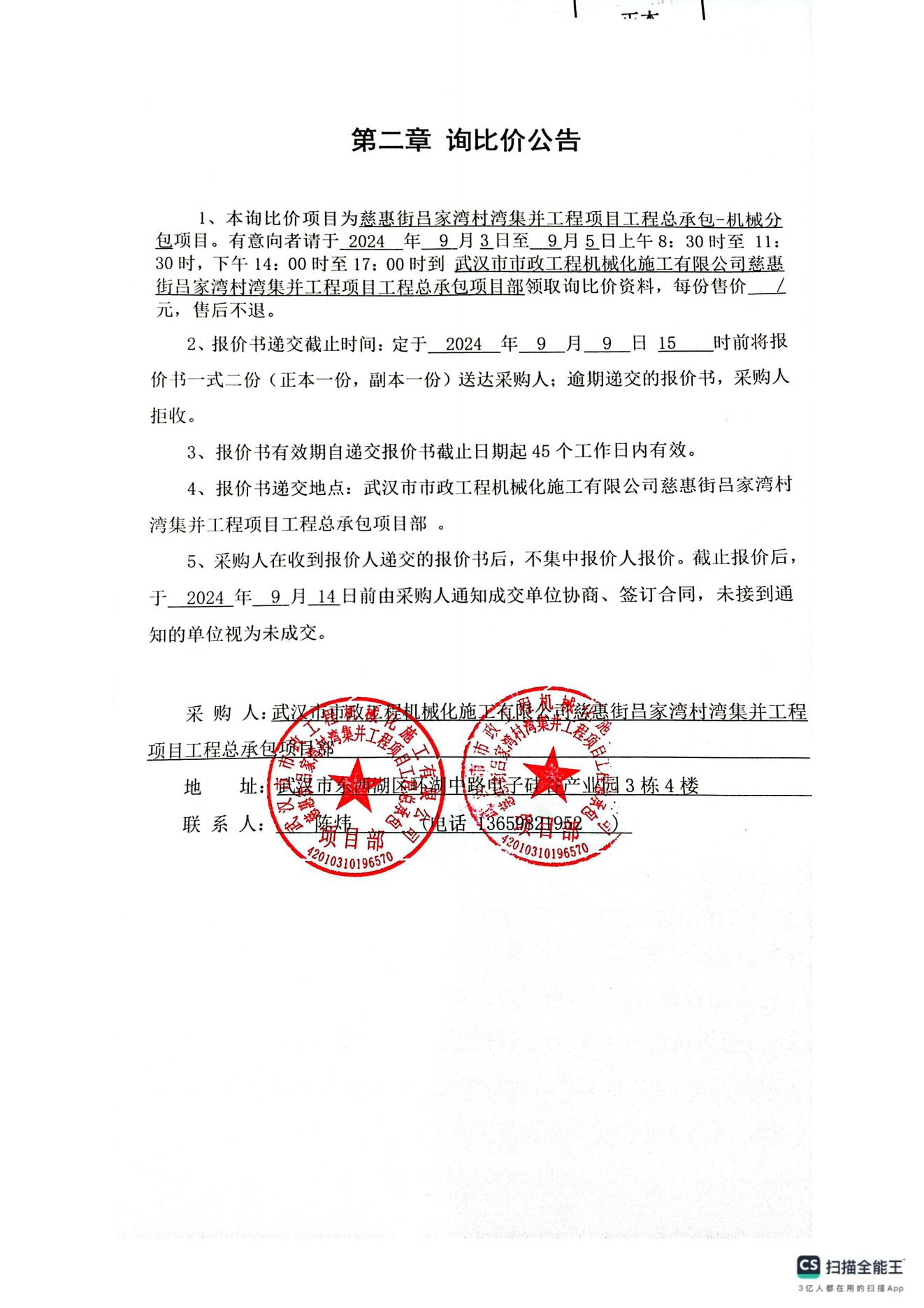 慈惠街呂家灣村灣集并工程項(xiàng)目工程總承包-機(jī)械分包詢價(jià)公告
