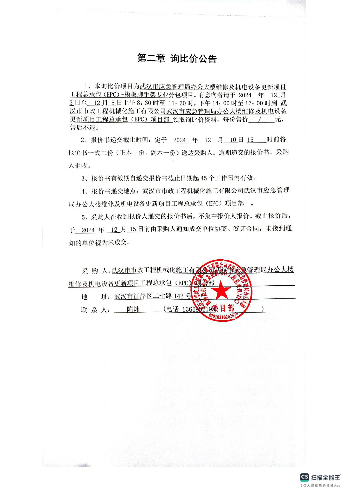 武漢市應急管理局辦公大樓維修及機電設備更新項目工程總承包(EPC) -模板腳手架專業分包詢價公告