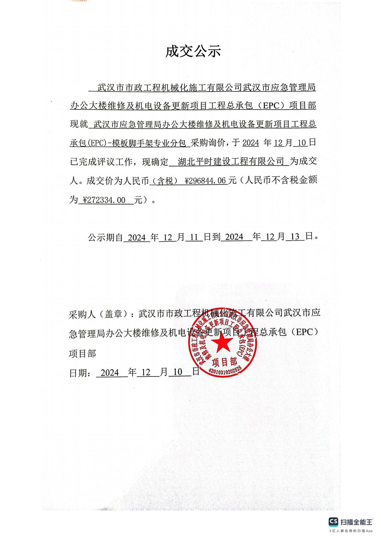 武漢市應急管理局辦公大樓維修及機電設備更新項目工程總承包(EPC) -模板腳手架專業分包成交公示